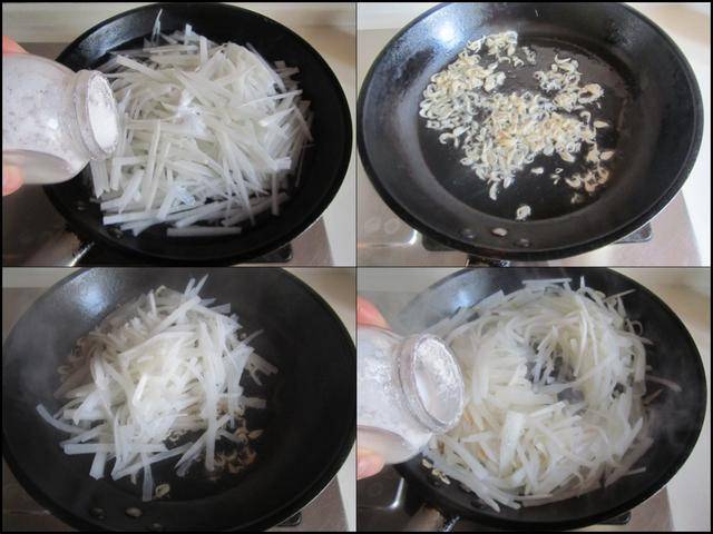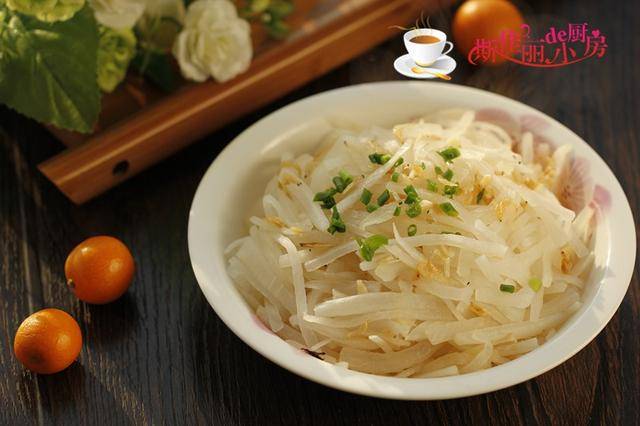 制作过程: 将白萝卜去皮后切成细丝备用; 烧锅水加入1小勺盐,将白萝卜丝放进锅中焯煮两分钟后捞出备用; 烧热锅放入适量的油,加入少许蒜末放进锅中煸炒香,再加入虾米放进锅中翻炒香,加入焯好的白萝卜丝放进锅中翻炒几下,再加入少许盐调味, 翻炒均匀后撒入少许葱花即可。