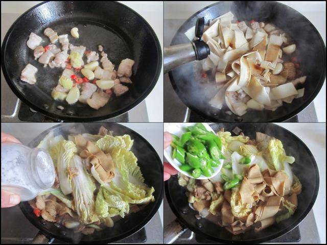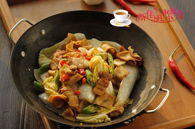 制作过程: 烧热锅放入少许油,将五花肉片放进锅中翻炒至微微出油,加入姜蒜片放进锅中翻炒几下, 再将切好的千张条放进锅中翻炒几下,加入少许生抽和料酒翻炒上色,再加入大白菜叶放进锅中翻炒至微微发软,加入少许盐调味翻炒均匀,最后加入少许青红椒圈放进锅中继续翻炒几下即可。