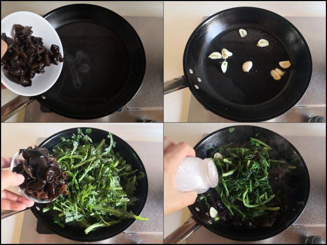 制作过程: 提前将黑木耳用冷水泡软备用, 茼蒿洗净备用,蒜切成片备用。烧锅水加入1小勺盐,将黑木耳放进锅中焯煮两分钟捞出备用。 烧热锅放入适量的油,加入少许蒜片爆香,再加入洗净的茼蒿翻炒至微微变色,加入焯好的黑木耳放进锅中翻炒两下,加入少许盐调味,翻炒均匀即可。