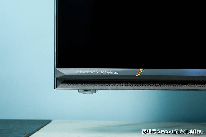 最后,让我们看看海信U7S Pro的外观。这款电视在设计上充满高级感,全金属一体成型机身,线条干练,彰显精工品质。RGB(红绿蓝)三色金属徽章点缀其上,为机身增添亮点。