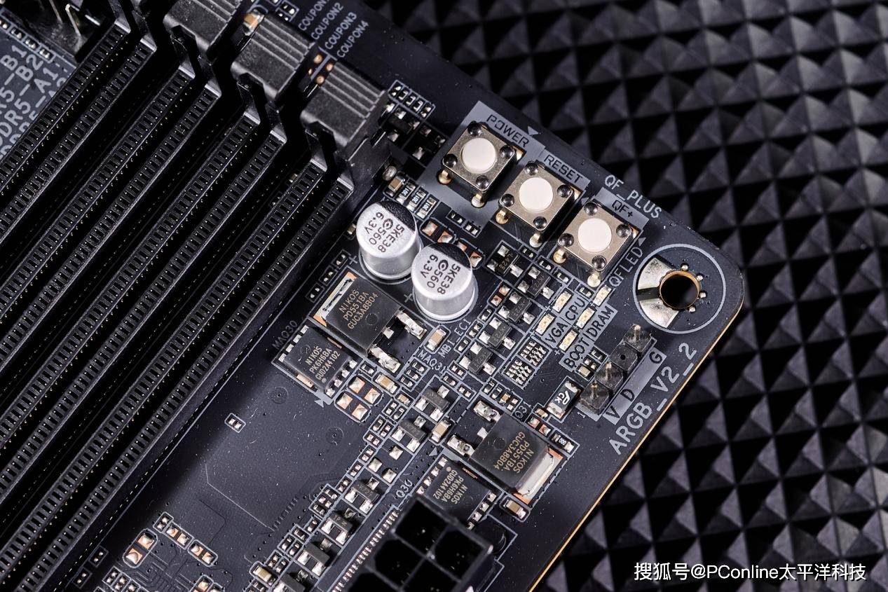 主板还提供了一组超频调试按钮和Debug灯组,可以让用户快速了解主板当前状态,精准排查启动异常。尤其是喜爱超频的玩家,可通过重启按钮与清除CMOS按键快速调试,大幅提升装机与调校效率。