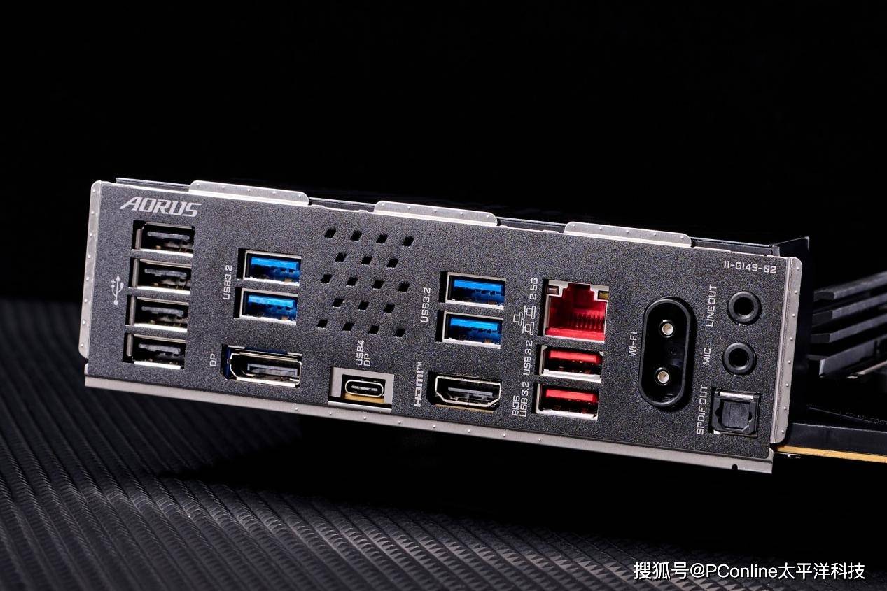 尤其是左侧的装甲部分更是延展到了后置IO区域,形成一体化的散热结构。同时装甲表面还覆盖了装饰卷板,上面印上AORUS艺术字设计,配合上独特的ARGB灯效,极具潮流感。