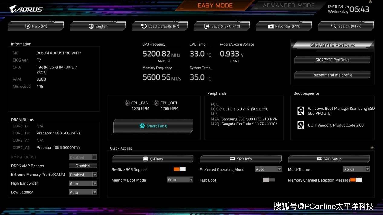 进入技嘉B860M电竞雕主板BIOS,并利用U盘刷新到最新版本的F7,以确保主板对新硬件的兼容性与性能调校达到最佳状态。BIOS界面延续技嘉一贯的简洁逻辑设计,易用性与功能性兼具。