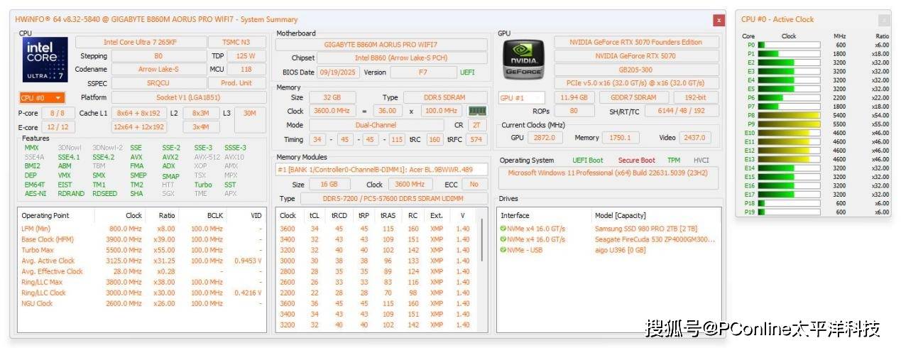 测试平台方向,我们选用了来自Intel 酷睿ULtra 7 265KF处理器,搭配宏碁掠夺者Hera影锋RGB超频电竞内存,NVIDIA GeForce RTX 5070显卡,构建了完整的高端游戏与创作平台。