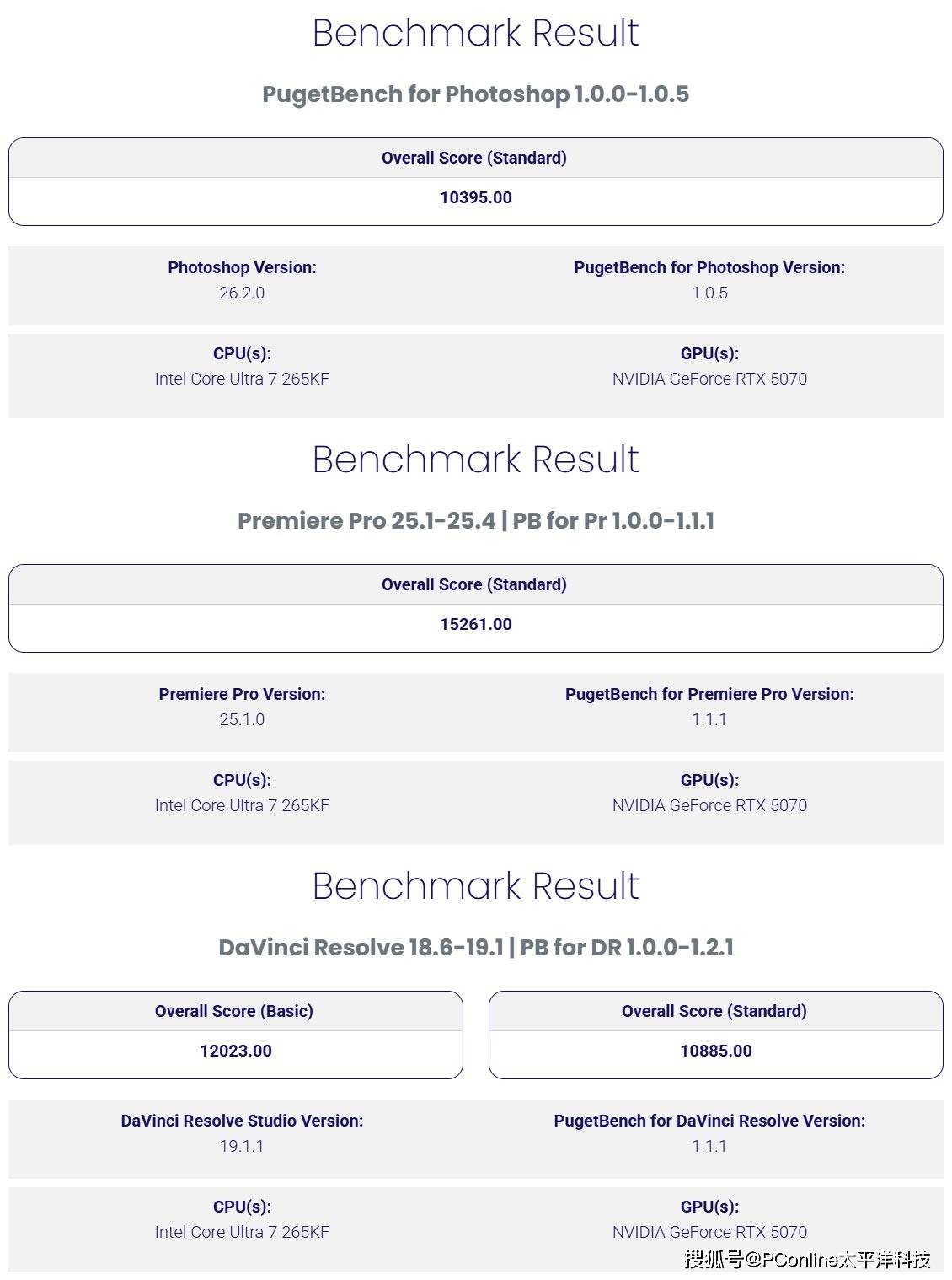 一整套创作者测试软件包括Pugetbench for PS、PR及达芬奇中,均展现出卓越的生产力表现。UL Procyon软件中的图像处理与视频编辑测试也取得了优异成绩。