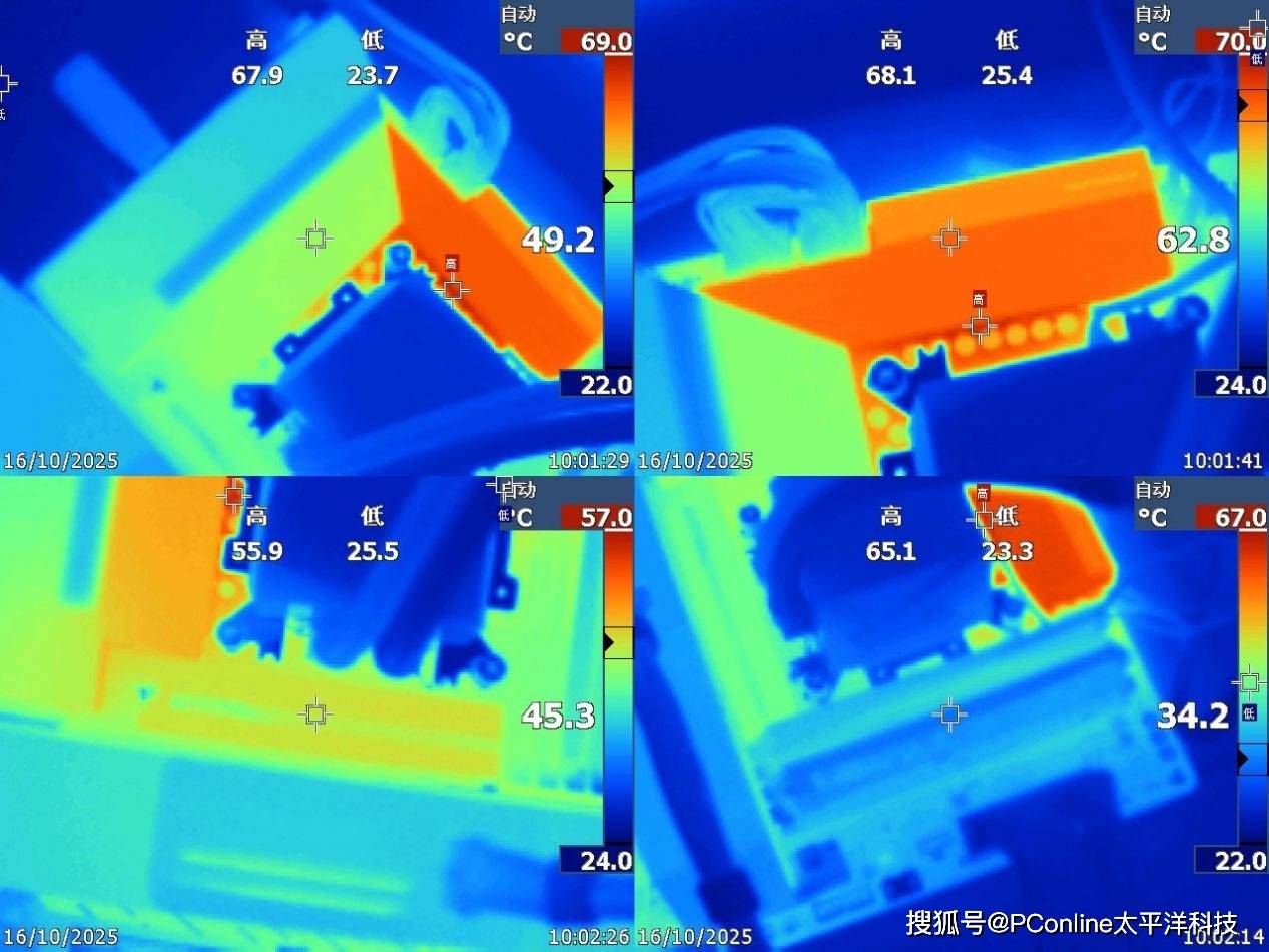 同步拿热成像仪对主板进行扫描,发现供电区域温度分布均匀,主要热源集中在主板的上方VRM供电模块上,无明显热点堆积现象,侧面印证了其高效散热设计与优质用料的协同表现。