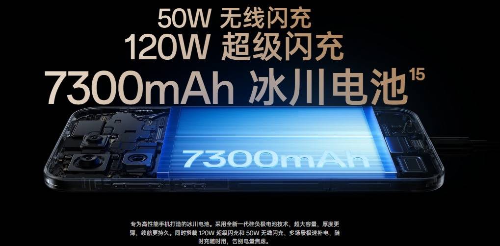 续航和充电方面,7300mAh冰川电池专为高性能旗舰打造,采用新一代硅负极电池技术,在提升能量密度的同时实现更轻更薄的机身设计,带来更持久的续航表现。配合120W超级闪充与50W无线闪充,仅需5分钟即可追剧6小时,无论有线或无线,都能实现多场景极速补电。实测数据显示,导航续航12小时、短视频19小时、高帧游戏9小时,其中《大型格斗游戏》原生165帧连续运行7.6小时,《大型FPS游戏》可达6.6小时,续航表现行业领先。
