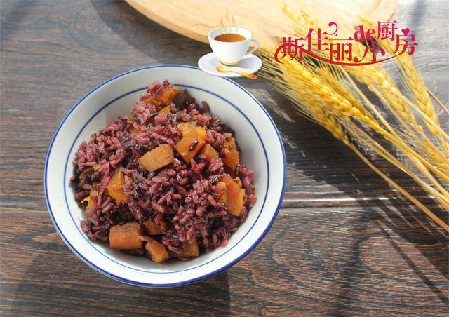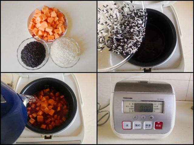 制作过程: 将红薯去皮后切成小丁备用。 将紫米和梗米混合后洗净放入电饭煲中,加入准备好的红薯丁,再加入适量的水,按下电饭煲上煮米饭的功能键, 时间到,“红薯紫米饭”就煮好了。