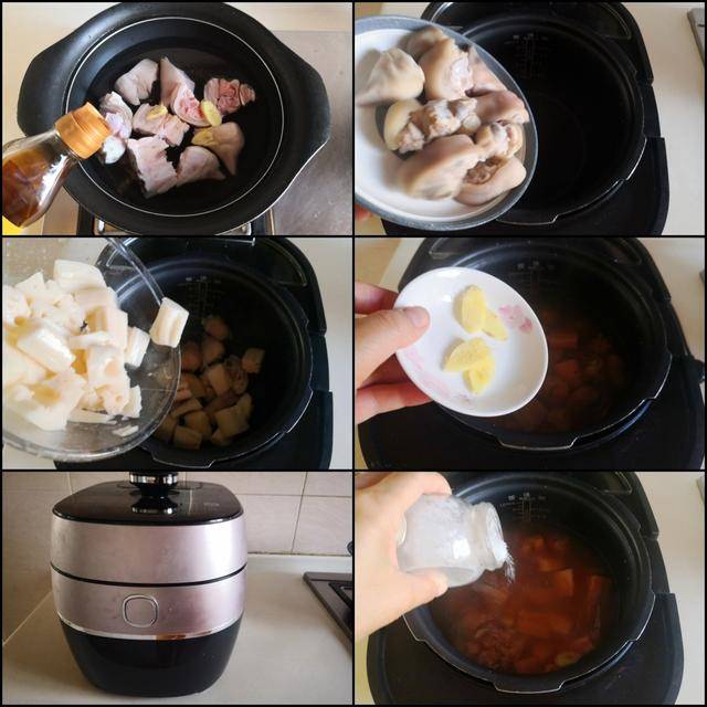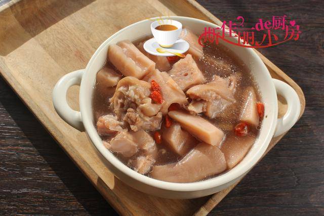 制作过程: 将蹄花和莲藕切成块备用; 烧锅水,将蹄花块放入冷水锅中,加入姜片和料酒帮助去腥,焯出浮沫后捞出放入电炖锅中。将准备好的莲藕放进电炖锅中,加入少许姜片,加入适量的水,注意煲汤时水要一次性加足,不要中途加水,按下电炖锅上炖煮骨汤的功能键,待到“莲藕蹄花汤”炖煮好后,加入少许盐和胡椒粉调味,撒入一把枸杞即可。
