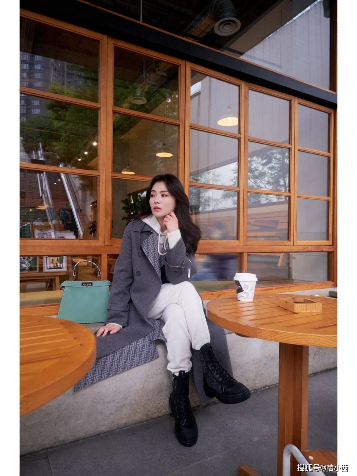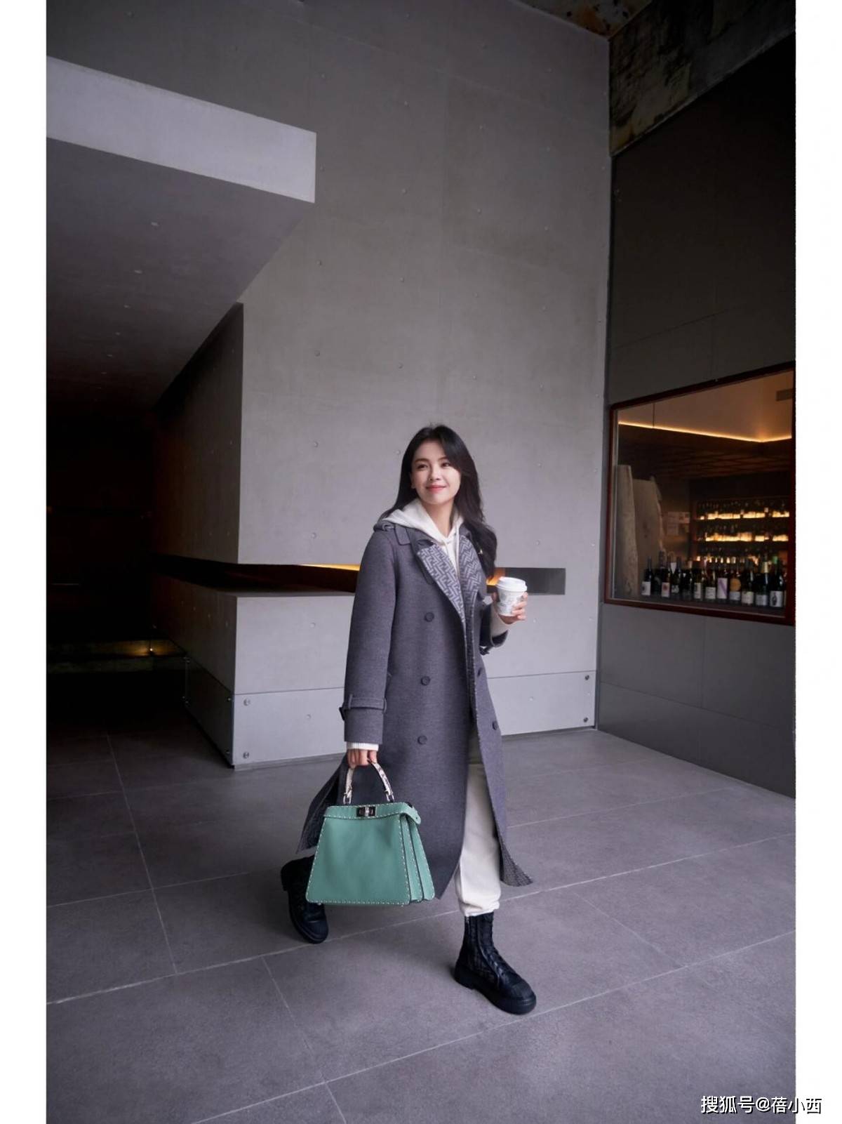 内搭选了同色系高领衫,和大衣颜色几乎融为一体,视觉上纵向拉长了比例。这一身搭配最加分的是长筒靴,搭配长款大衣和打底裤,不仅抬了身高,又和大衣的松弛感呼应,踩在台阶上有种“不费力的精致”,时髦极了。