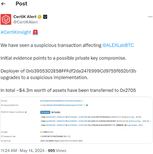 最近,区块链安全公司CertiK发布了一份报告,指出BNB智能链上的Alex协议桥疑似遭遇攻击,损失高达430万美元。这起事件再次引发了人们对区块链安全性的担忧。