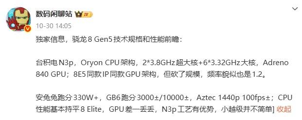 根据认证信息,90W快充将成为vivo S50系列的标准配置,延续了该系列在充电效率方面的一贯优势。更值得关注的是,系列中的Pro mini版本有望搭载尚未正式发布的骁龙8 Gen5处理器。据爆料,该芯片采用台积电N3P工艺,配备Oryon架构的2个3.8GHz超大核与6个3.32GHz大核,GPU为Adreno 840,整体性能表现值得期待,安兔兔跑分预计突破330万。