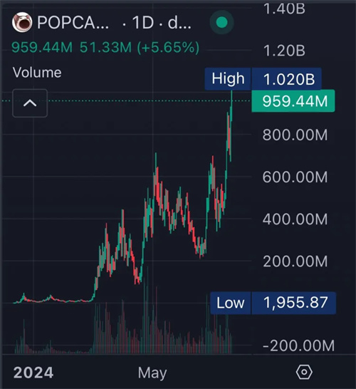 Popcat继续其上升势头,在7月20日达到了10亿美元的市值,成为有史以来第一个达到这一里程碑的猫表情币。根据CoinGecko的数据,第二天,该代币达到了0.9939美元的历史新高。