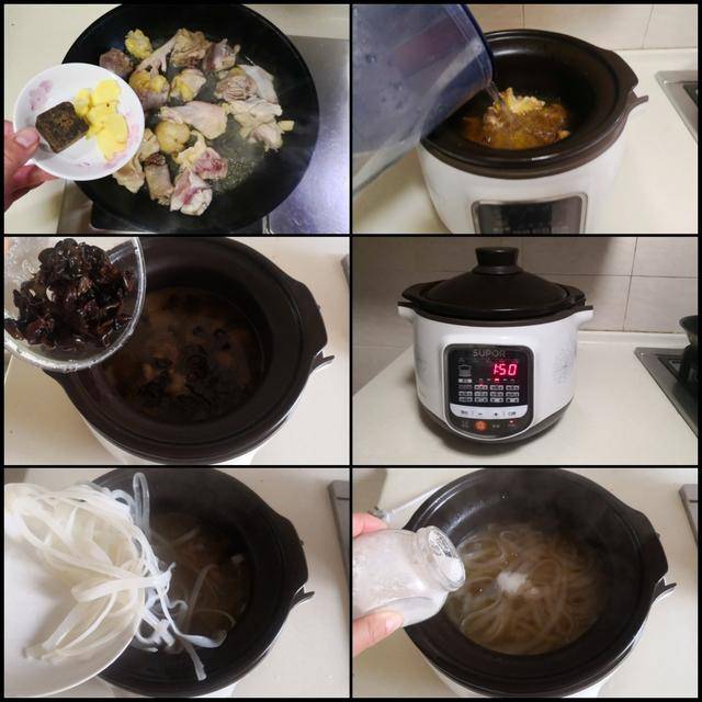 制作过程: 提前将黑木耳和宽粉条泡软备用; 烧热锅放入适量的油,将土鸡块放进锅中煸炒干水分, 再加入几片姜和1块老红糖翻炒均匀;将炒过的鸡块放入电炖锅中,加入适量的水(注意煲汤时水要一次性加足,中途不要加水),将泡软的黑木耳放进电炖锅中,加盖后按下电炖锅上炖煮鸡鸭汤的功能键, 还剩下20分钟时加入泡软的宽粉条(根据粉条煮软硬的时间调整), 炖煮好后加入少许盐和胡椒粉调味,盛入钵中撒上少许葱花即可。