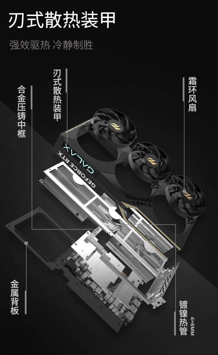 优雅的外表之下,必须有强大的“内芯”支撑。影驰为圣刃OC配备了全新升级的“刃X散热系统”。其采用的是3个90mm静霜风扇+4根镀镍复合热管组合而成,其中散热风扇采用了环形链结构+三折扇叶设计,可进一步增大风压降低风噪。得益于这套“豪华”的散热配置,确保了RTX 5070 Ti这颗强大的核心即便在长时间高负载运行下,也能保持“冷静”的温度。更重要的是,它支持智能风扇启停技术,在低负载(如浏览网页、观看视频)时风扇将完全停转,为你带来绝对的零噪音体验,实现了动若雷霆,静若处子。