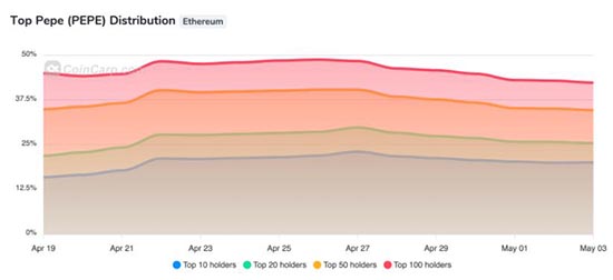 CoinCarp 的数据也显示,前 100 个最富有的 PEPE 巨鲸地址,控制着 45% 的代币流通供应,这中心化程度确实有点吓人。