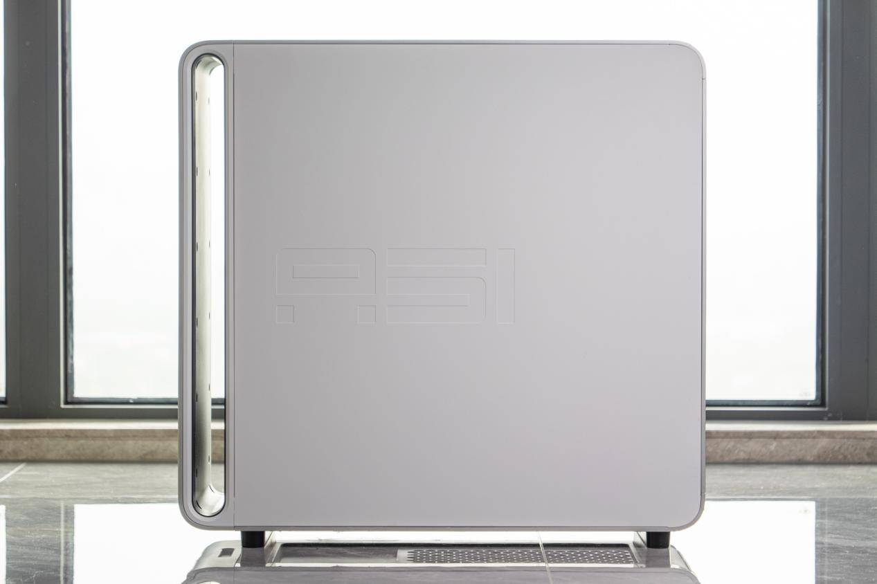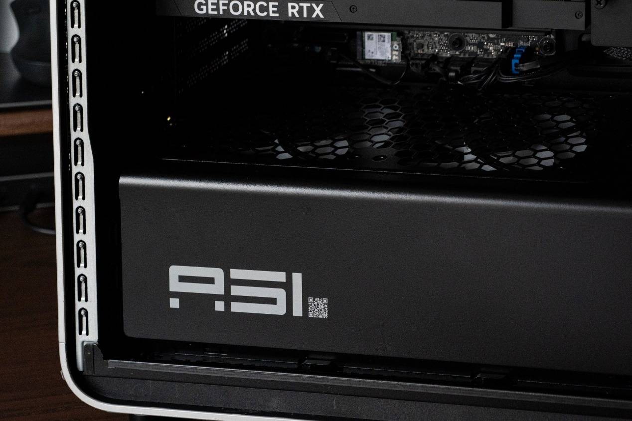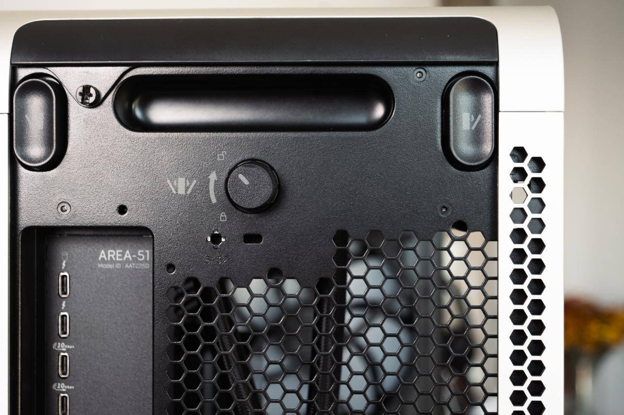 整机线条硬朗但不过分激进,整机并未使用任何夸张的结构拼贴,而是通过细节完成“外星感”的表达,顶部大面积散热格栅、前面板镂空光环、银色金属背板上的 A51 字样。