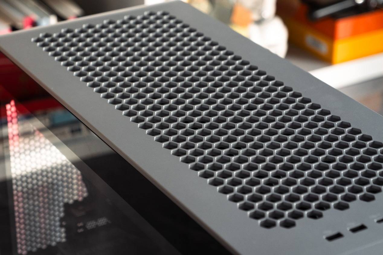 整机采用正压风道布局:顶部、前部与底部均配置风扇,统一负责冷气吸入;热空气则通过主板后方与显卡尾部排出,从而形成类“笔记本式”的风流路径。这种布局不仅效率更高,还能避免灰尘倒灌问题。