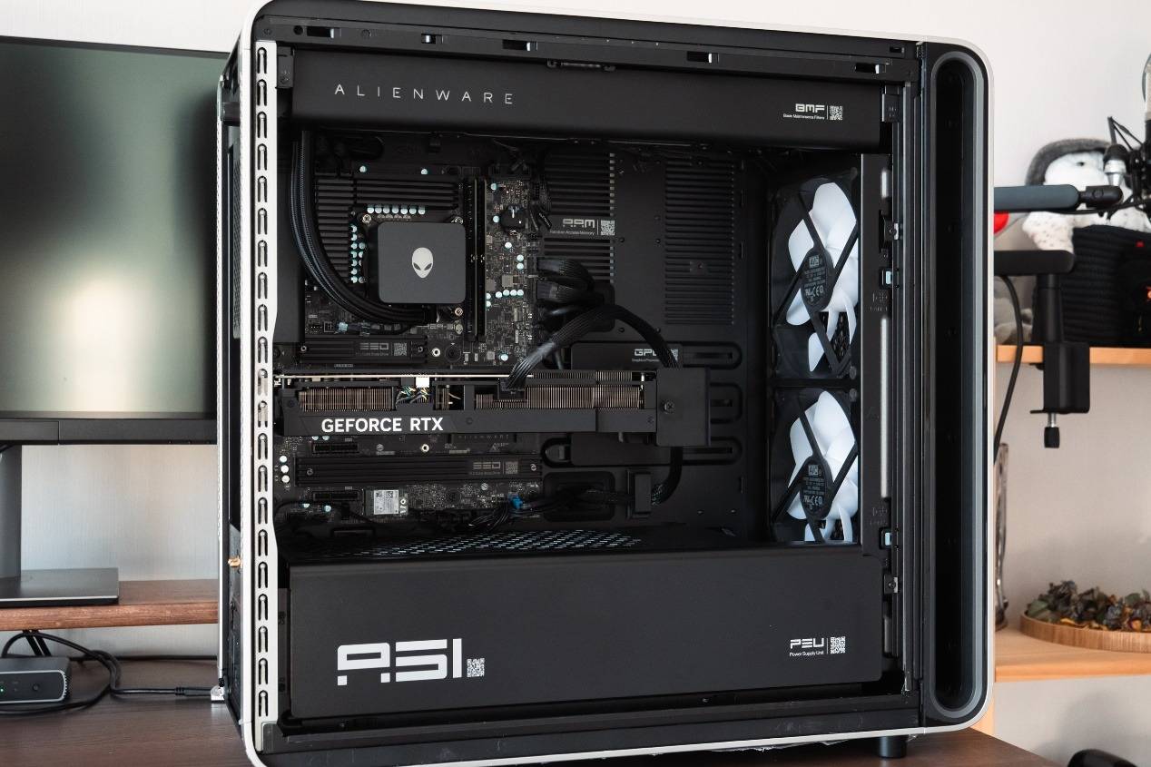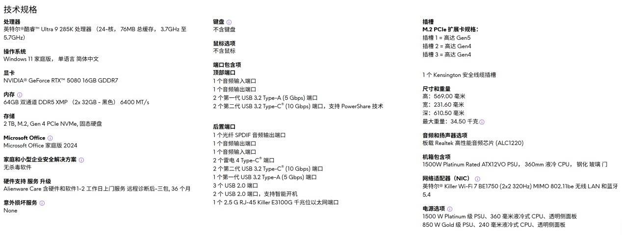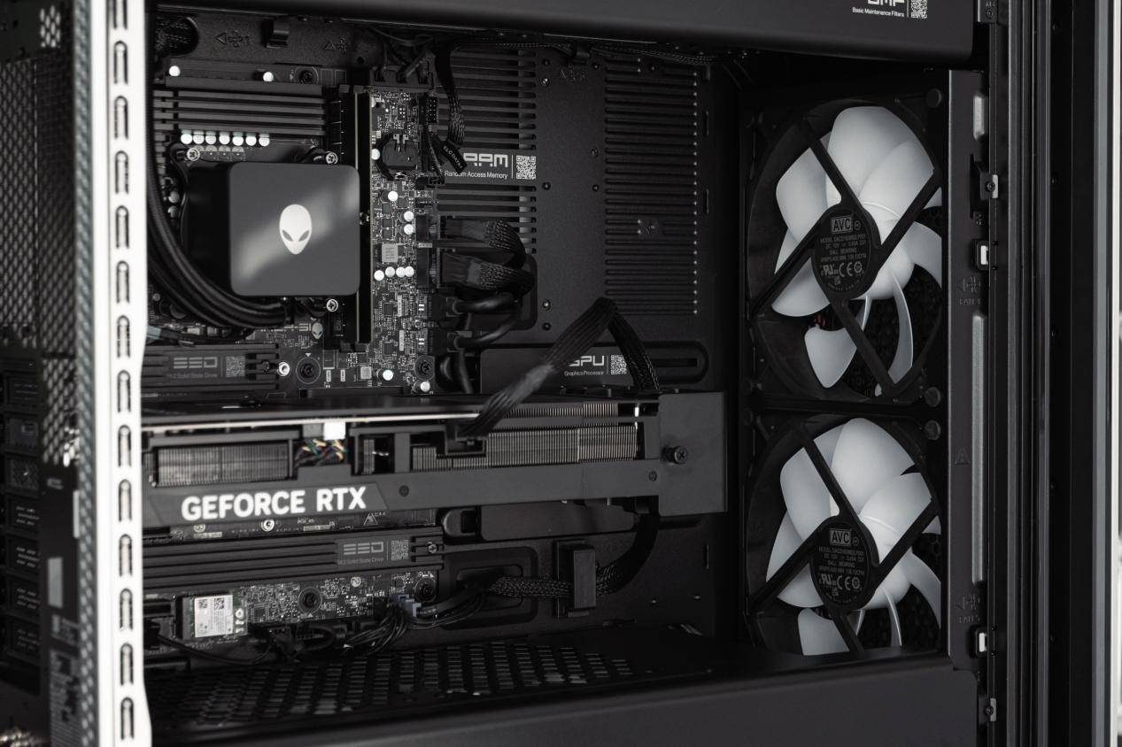 这台 Area-51 旗舰主机内部搭载了英特尔酷睿 Ultra 9 285K 处理器与 RTX 5080 显卡,配合64GB双通道DDR5 6400MHz高速内存与1500W白金ATX12VO电源,为整套系统提供了极高的性能、带宽与算力保障。