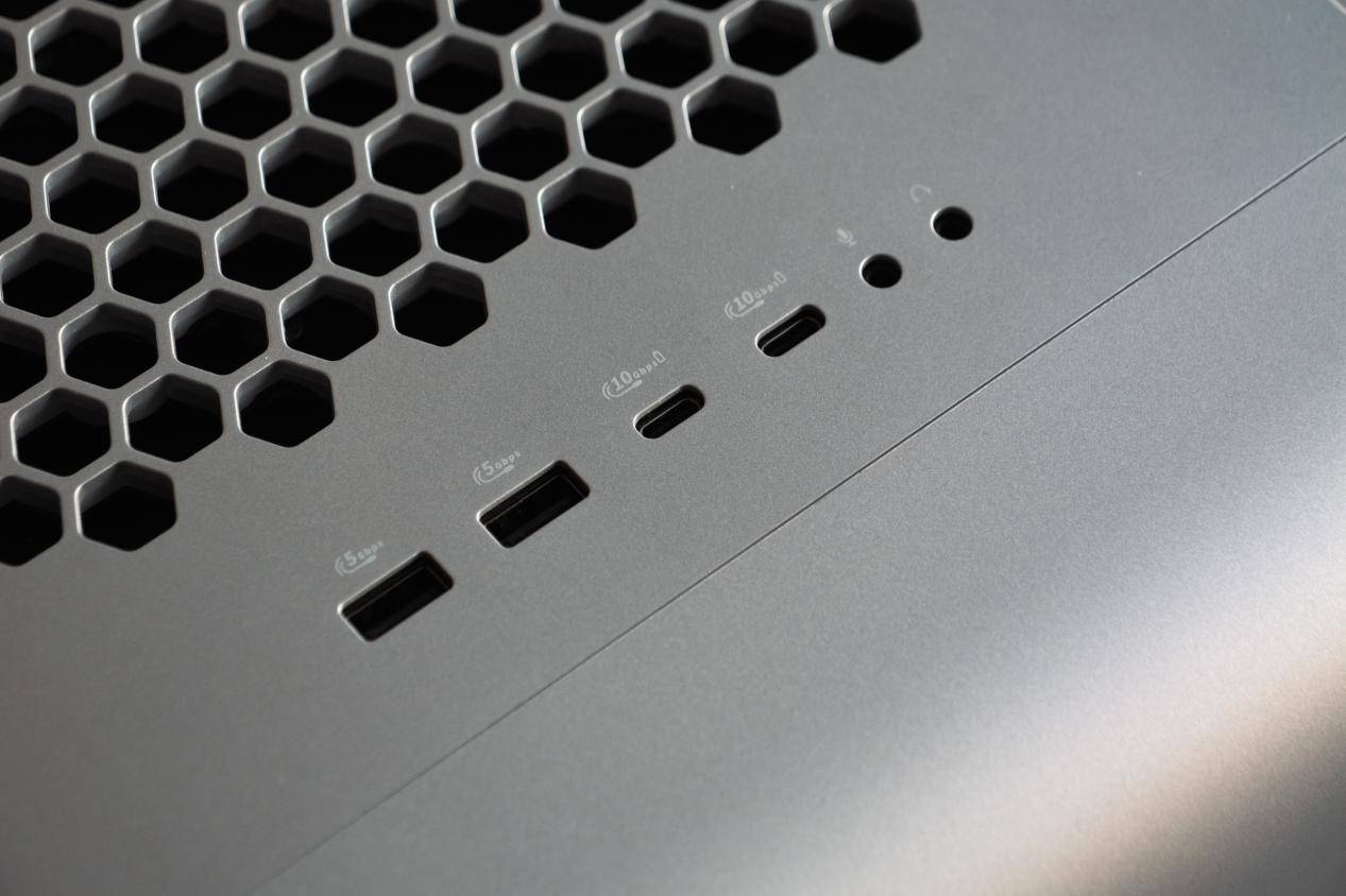 顶部前置则提供 2 个 USB-C、2 个 USB-A 与 3.5mm 音频输入输出口,便于主机地置时快速连接外设。