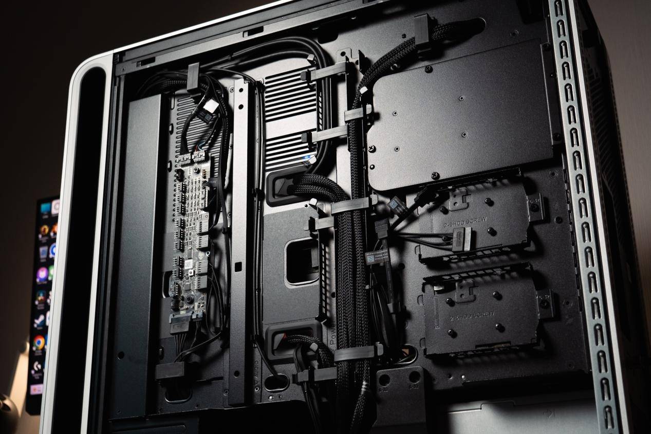 而底部的两个140mm风扇,则主要为1500W白金ATX12VO电源和主板下半区提供持续送风。这一整套散热系统并不是简单的堆料,而是按照空气动力学与气流分区逻辑构建的主动加压系统。