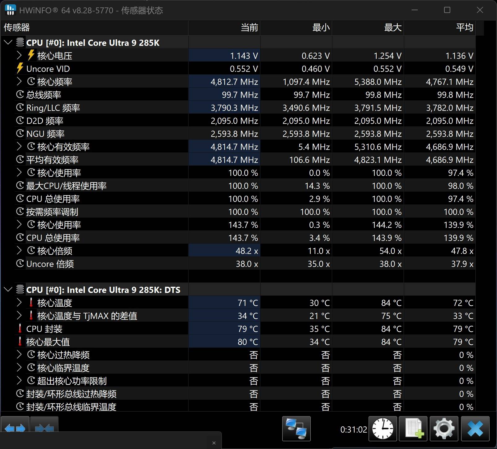 从 HWiNFO 实测数据来看,其核心温度在长时间高负载运行下的最高值为 84°C,平均温度仅 72°C,CPU封装温度最高79°C。这得益于整机内部强力水冷散热系统与双腔风道的高效配合,即使是长时间运行大型游戏或进行本地AI推理任务,也能保持较为理想的热表现,为全性能释放提供了坚实保障。