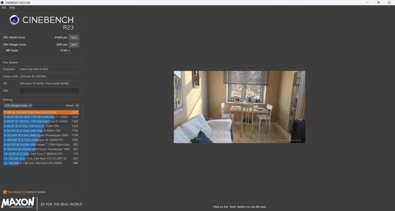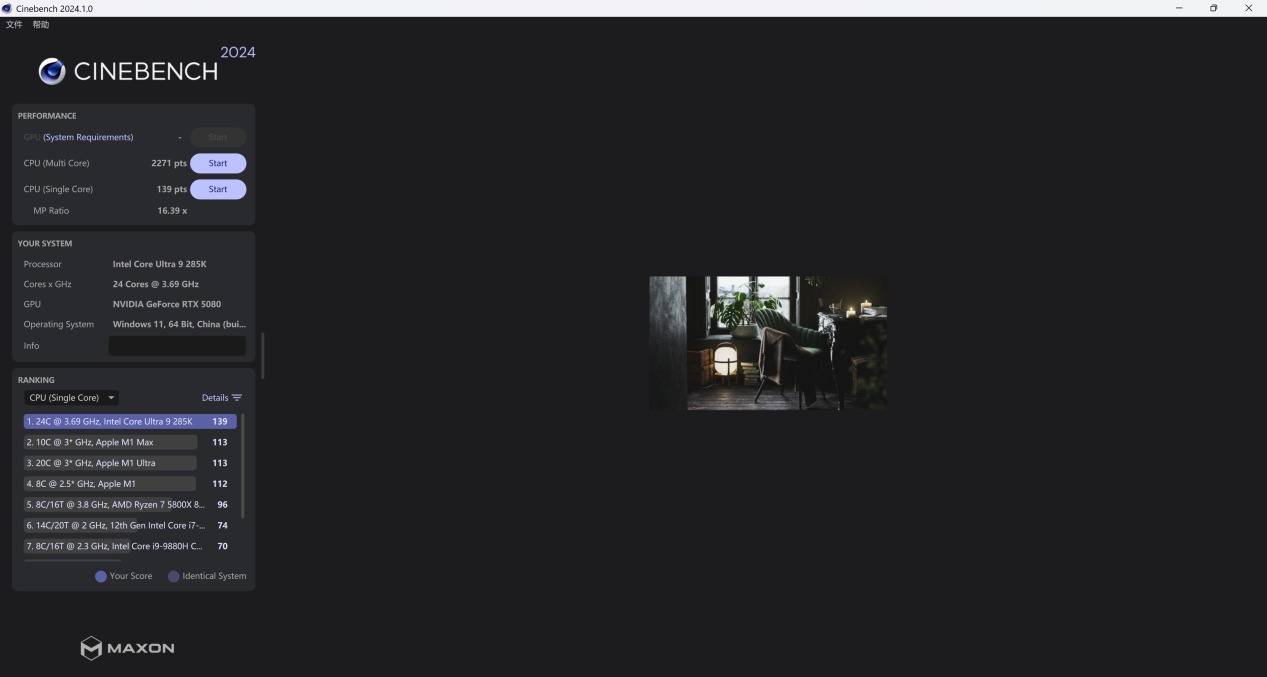 在理论性能测试中,酷睿 Ultra 9 285K 的表现出了性能上的优势。在 Cinebench R23 的测试中,这颗 24 核 32 线程处理器单核成绩达到 2287 分,多核则稳定在 41045 分,MP 比值达 17.95×。而在更新的 Cinebench 2024 版本中,其单核得分为 139 分,多核成绩 2271 分,进一步验证了它在面对高频短时负载与持续多线程渲染时的调度稳定性。