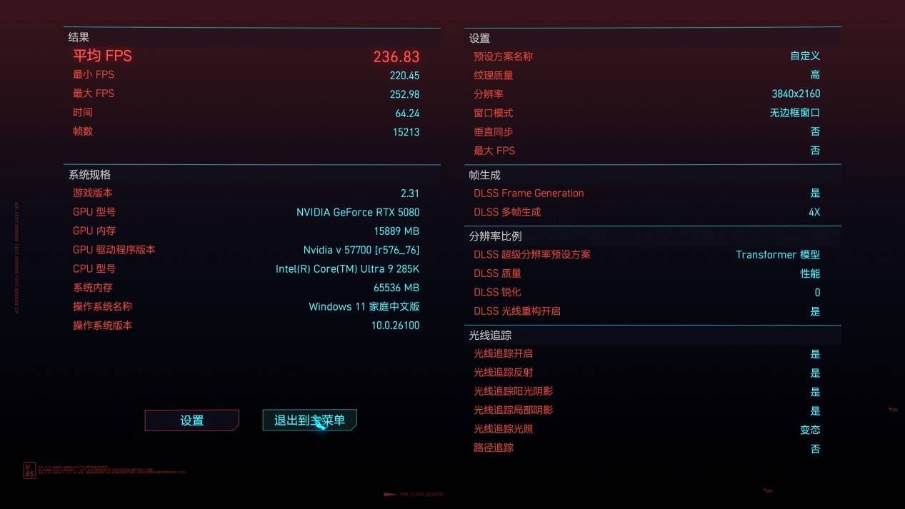 《赛博朋克2077》测试结果,平均帧率236.83FPS