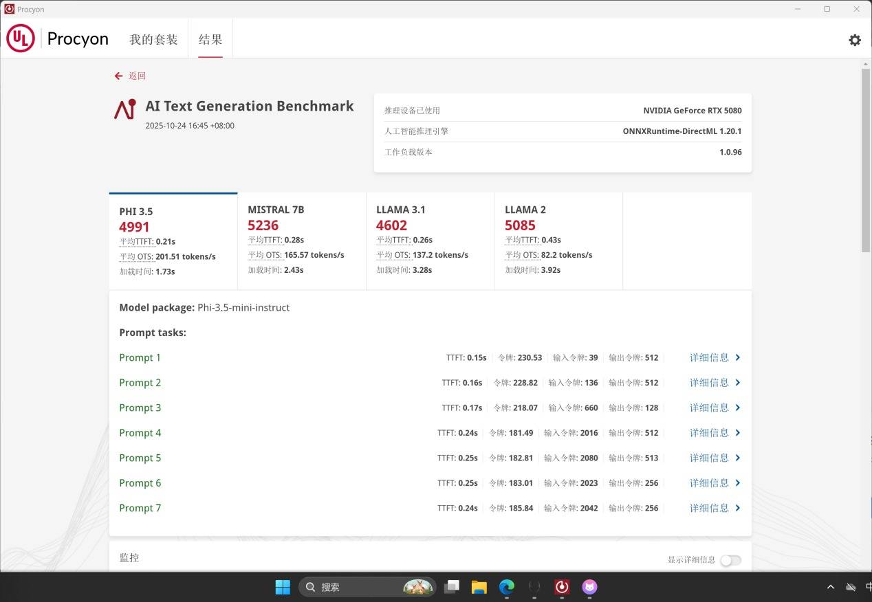 UL Procyon LLM 测试中涵盖 Phi-3.5、Mistral 7B、Llama-2/3 等模型,哪怕是 Llama 2 13B级别的大模型也能流畅推理,显示出RTX 5080在大语言模型上的通用计算能力。这些成绩说明,在 RTX 5080 强大 AI 加速能力和 DirectML 后端加持下,这台 Area-51 能够高效加载并运行多种主流轻量模型,在不依赖云端的前提下完成对话生成、命令执行、内容整理等 AI 办公任务。