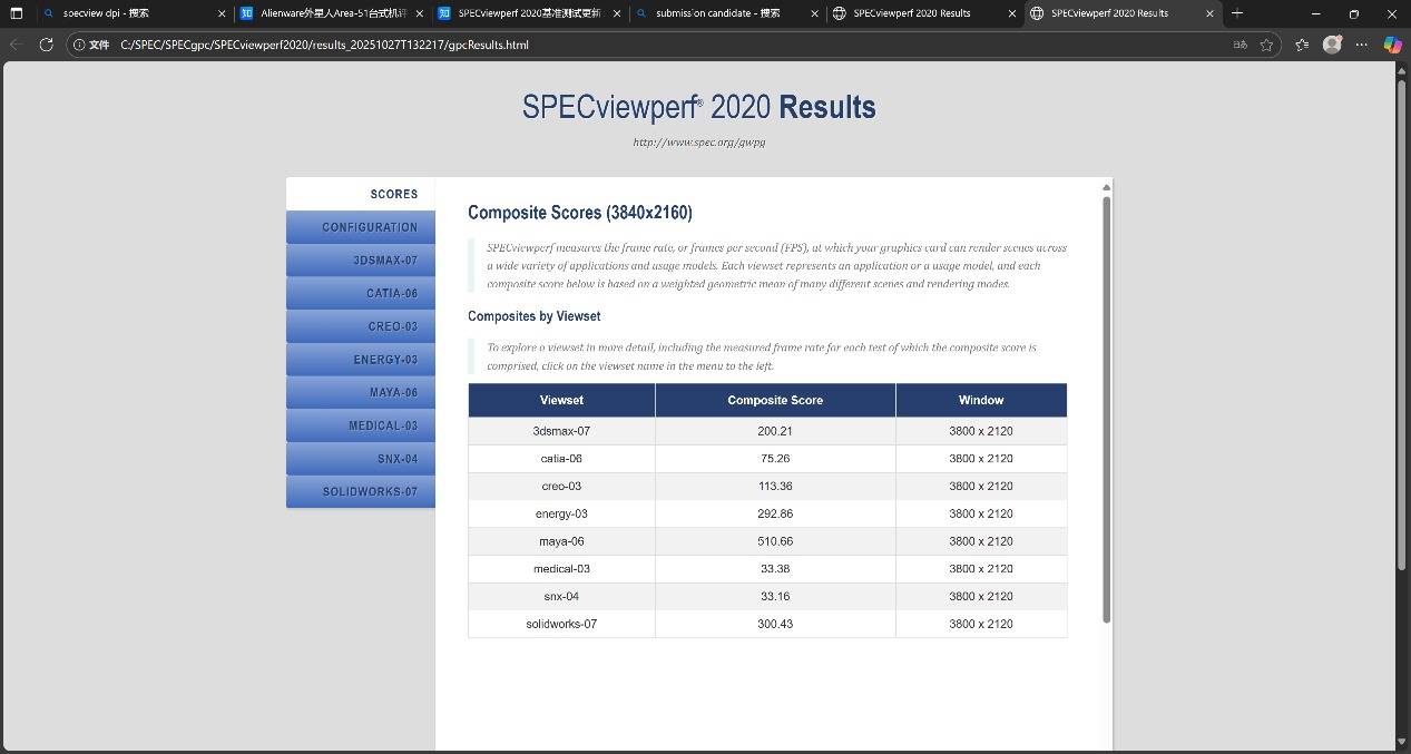 在专业图形领域的 SPECviewperf 2020 测试中,Alienware外星人Area-51 的表现同样可圈可点。得益于 RTX 5080 强劲的图形性能,系统在 4K 分辨率下依然可以流畅运行多个 CAD/CG 渲染类负载。
