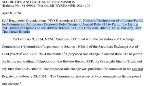 美国证券交易委员会(SEC)最近决定推迟对纽约证券交易所(NYSE)是否可以进行现货比特币(BTC)ETF期权交易的裁决。这个消息在4月8日提交的文件中公布,涉及到Bitwise比特币ETF(BITB)、灰度比特币信托(GBTC)以及在NYSE上市的所有其他比特币相关信托的期权交易。SEC表示需要更多的时间来充分评估和考虑这个提案。