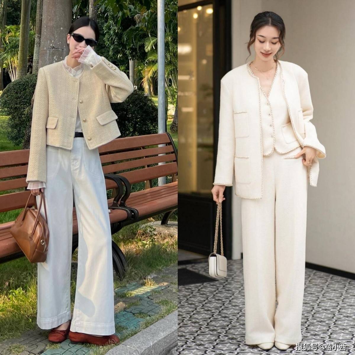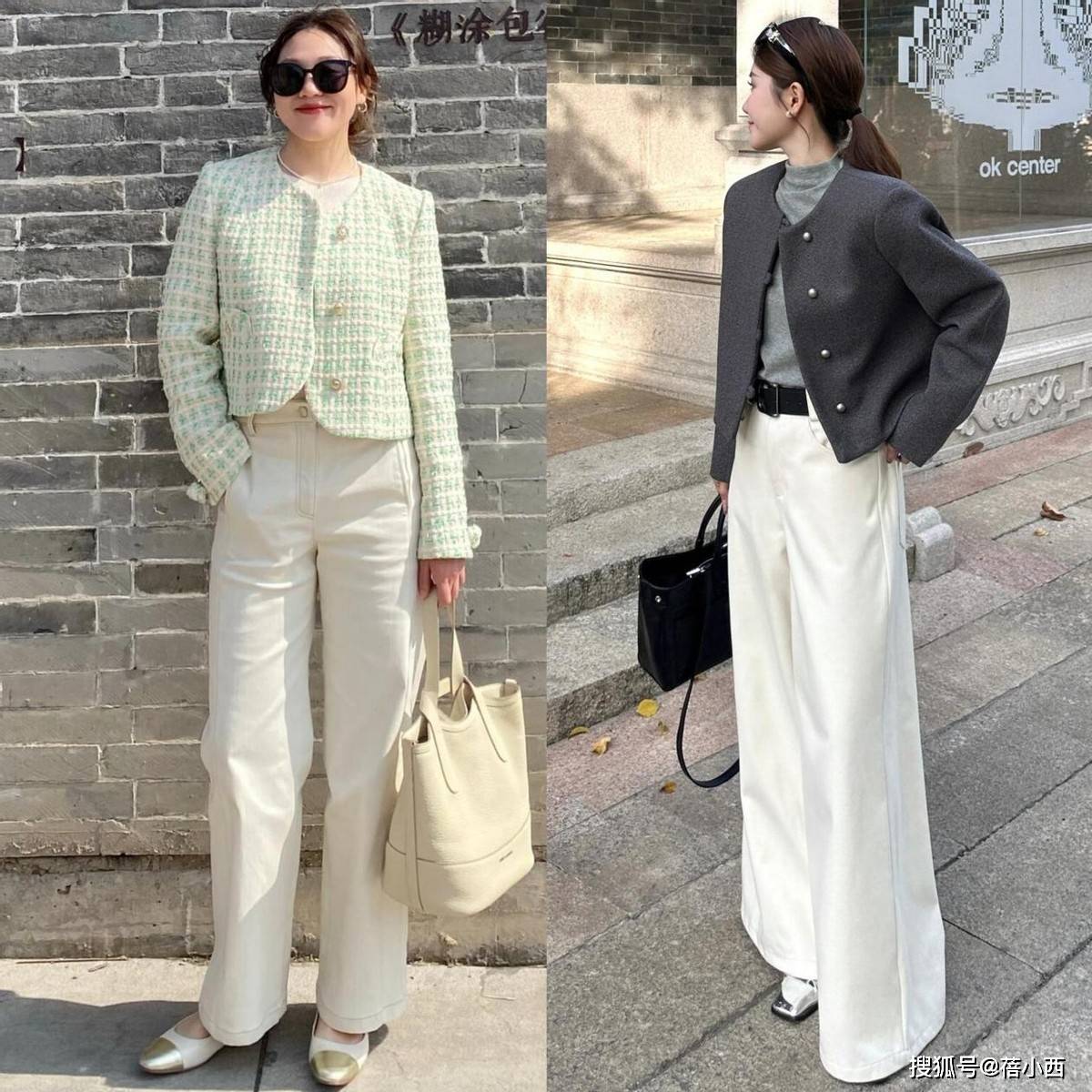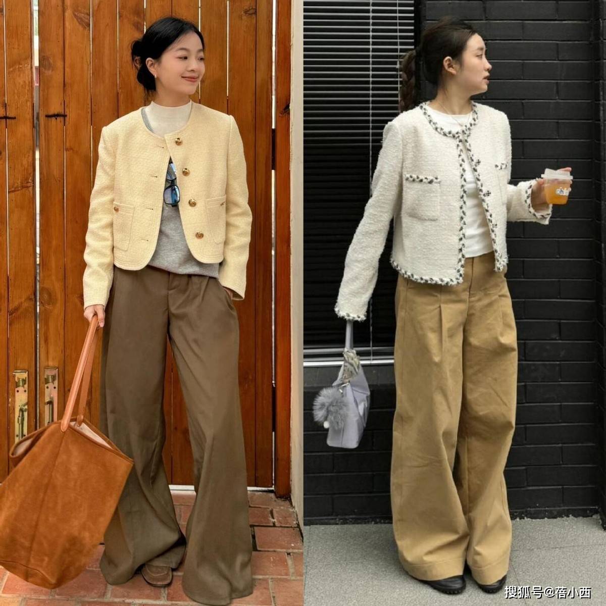 小香风作为跨越时光的经典,以粗花呢面料、精致滚边、质感金属扣为标志性元素,自带简约知性的奢华感,恰好适配40+女生对穿搭“得体又有格调”的核心需求,而阔腿裤的加入,则为这份优雅注入了随性张力。