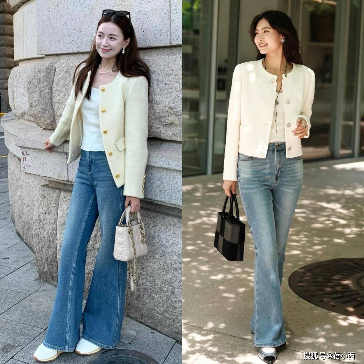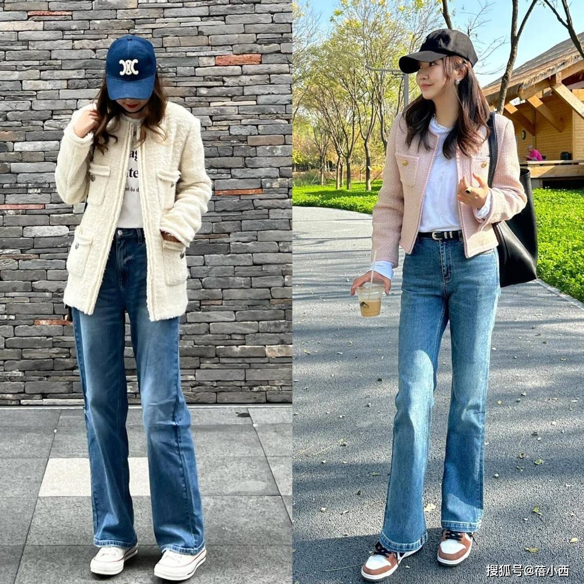 身材凹凸有致的美眉也可以用微喇牛仔裤搭配短款的小香风外套,分割了比例,还可以让我们的身材曲线秀出来,再搭配一双平底单鞋,更能无形中凸显时尚感。