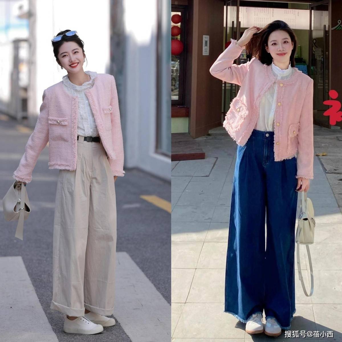 喜欢甜美风的小姐姐们可以选这种粉色的小香风外套,穿在身上特别的温柔减龄,然后在下半身配上一条高腰的阔腿牛仔裤,能弱化甜美感,显得更加松弛大方。