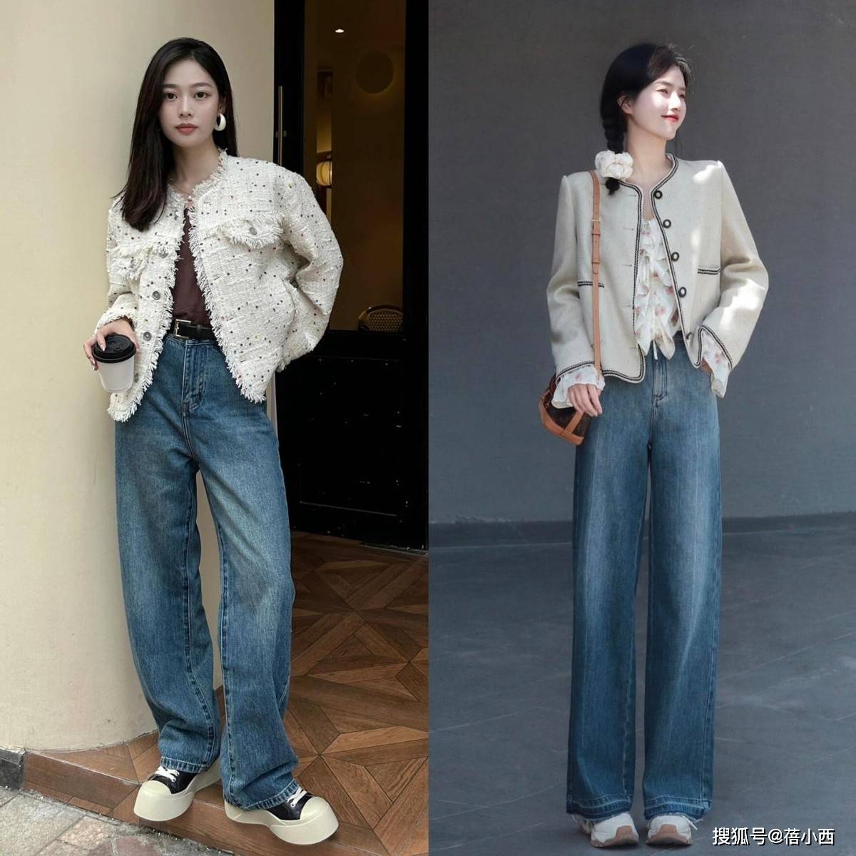 如果你喜欢休闲感搭配,可以尝试这种简约款的小香风外套,搭配阔腿牛仔裤和帆布鞋,鞋子和裤子的风格一致,能强化整体搭配的松弛感,显得随性洒脱。