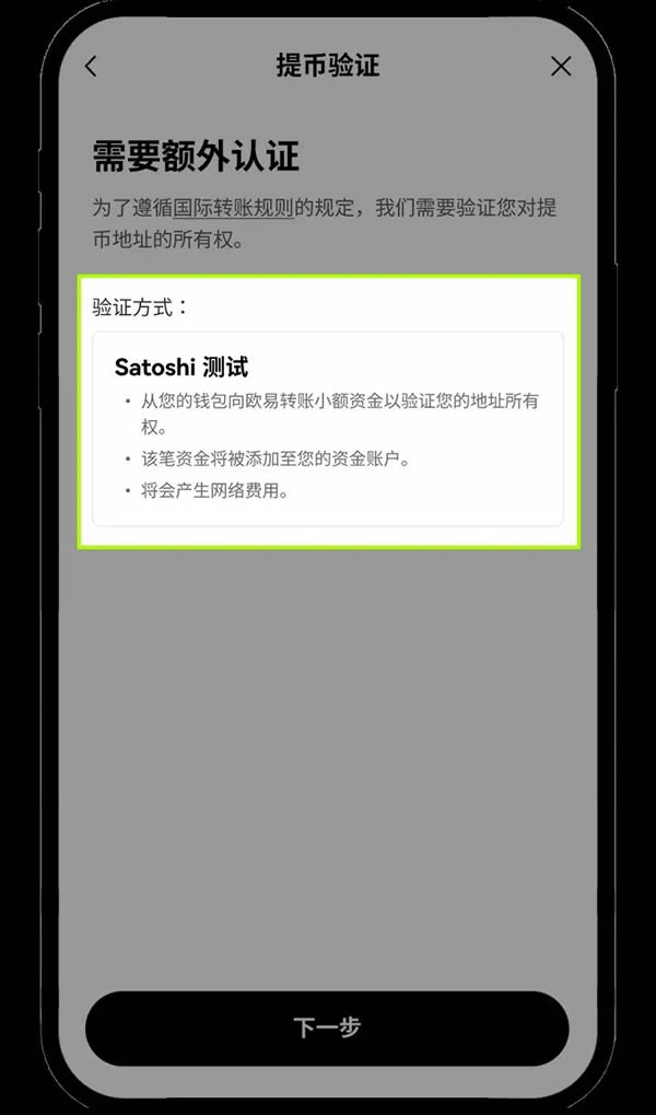 Satoshi 测试: 如果选择了 Satoshi 测试,选择“下一步”,您将进入验证流程。