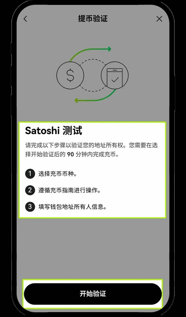 Satoshi 测试是平台实施的一项安全措施,用于验证您是否实际掌控提币的wallet地址。在 Satoshi 测试时,您需要向平台提供的特定地址发送一小笔确切金额的加密货币,来完成验证。