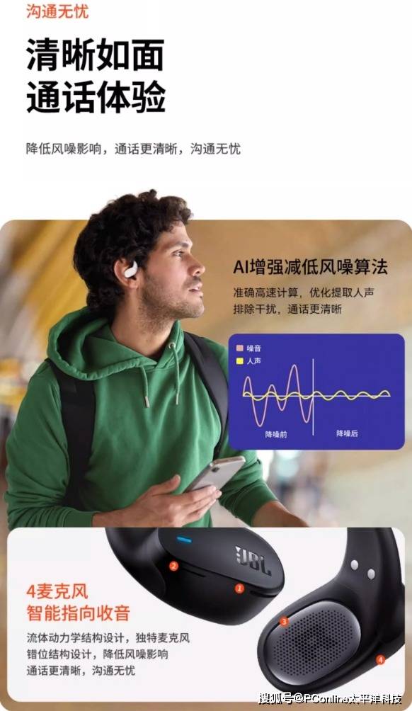 当然,开放式耳机还有一个绕不开的痛点——“漏音”。在安静的办公室或电梯里,如果耳机漏音严重,无疑会让使用者和旁人都陷入尴尬。JBL音悦圈舒适版通过逆向位角声波技术来解决这一问题,能够减低外泄声音成分,保护隐私。