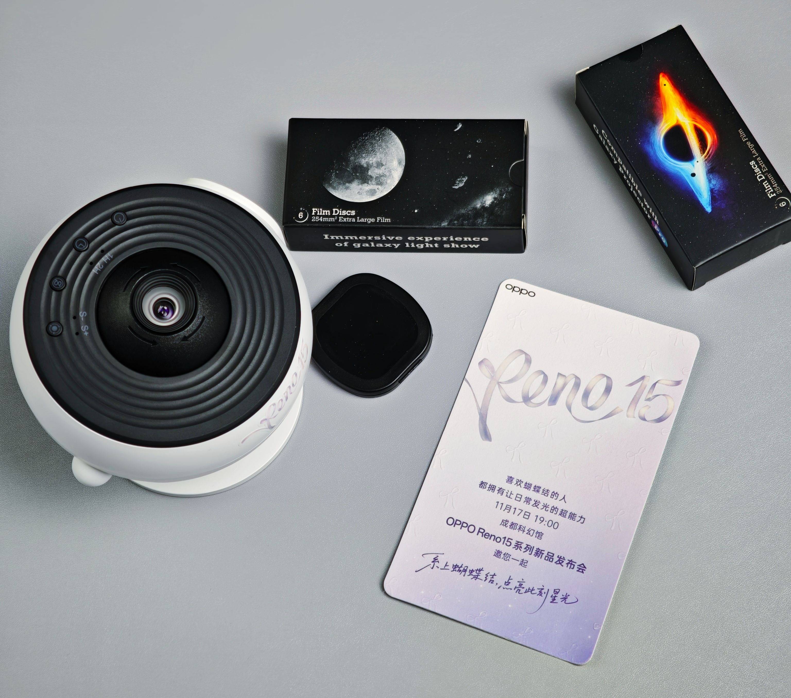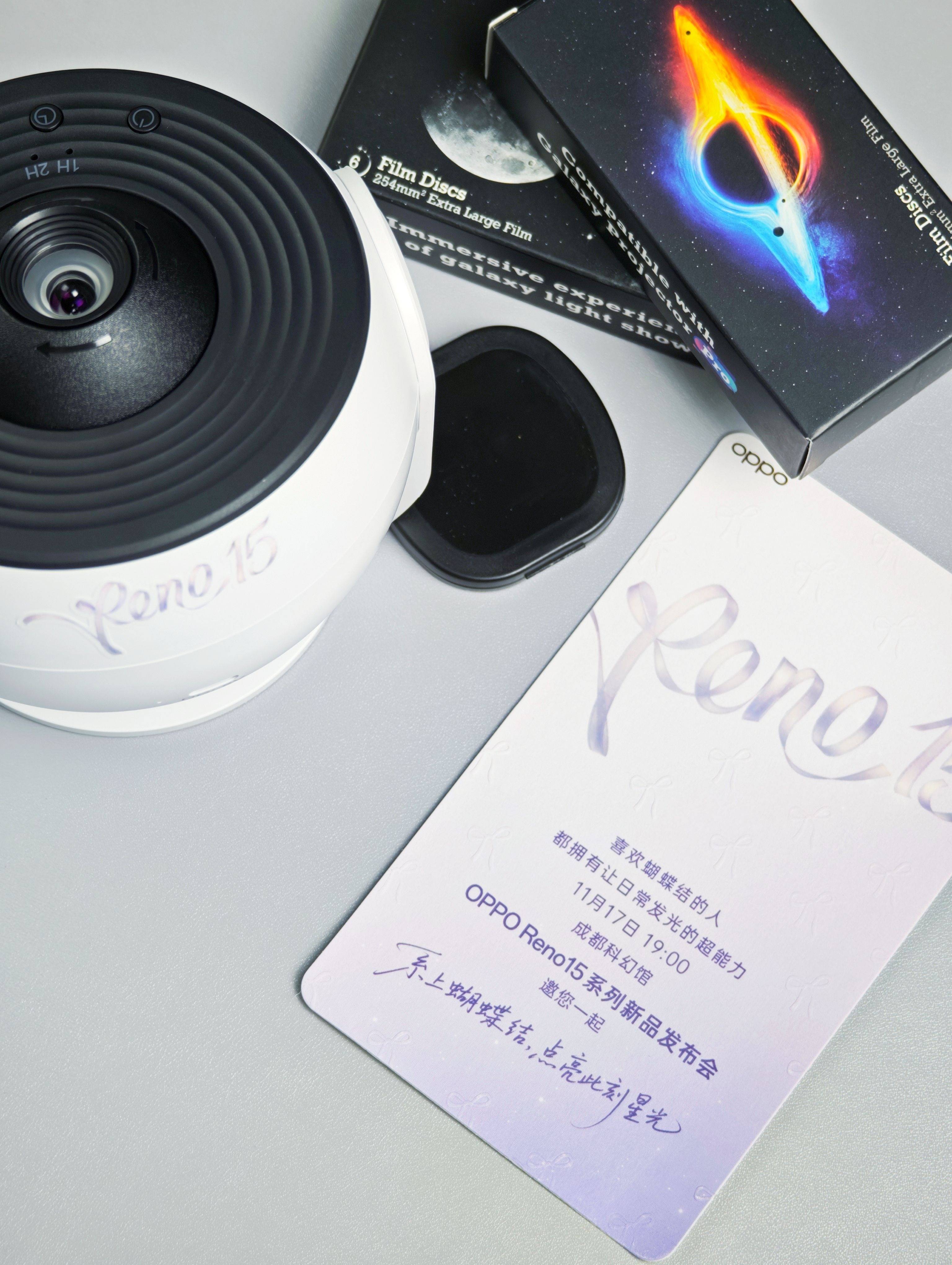 邀请函中最引人注目的是一款定制星空投影灯,其包装盒顶部装饰着精致的蝴蝶结元素,与邀请函上的蝴蝶结凸印设计相呼应。这款投影灯配备了特别定制的Reno15主题灯片,以及13款不同风格的图案灯片,用户可根据心情自由切换,完美诠释了“系上蝴蝶结,点亮此刻星光”的设计理念。