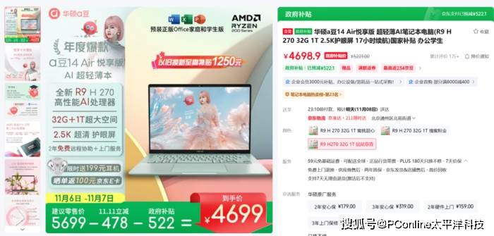 双十一可以说是每年最划算的数码换新好时机,年末大促火热进行中,你是不是也在考虑为自己换一台更智能、更高效的新笔电?对于既想要时尚外观,又追求强劲性能和AI智能体验的小伙伴们,强推「华硕a豆14 Air 悦享版」。购机立减478元,部分地区还能叠加至高10%政府补贴(活动详情可咨询客服了解),到手价仅4699元,是双十一入手高颜高能AI轻薄本的最佳选择。