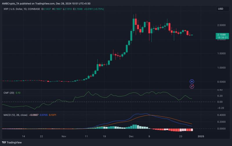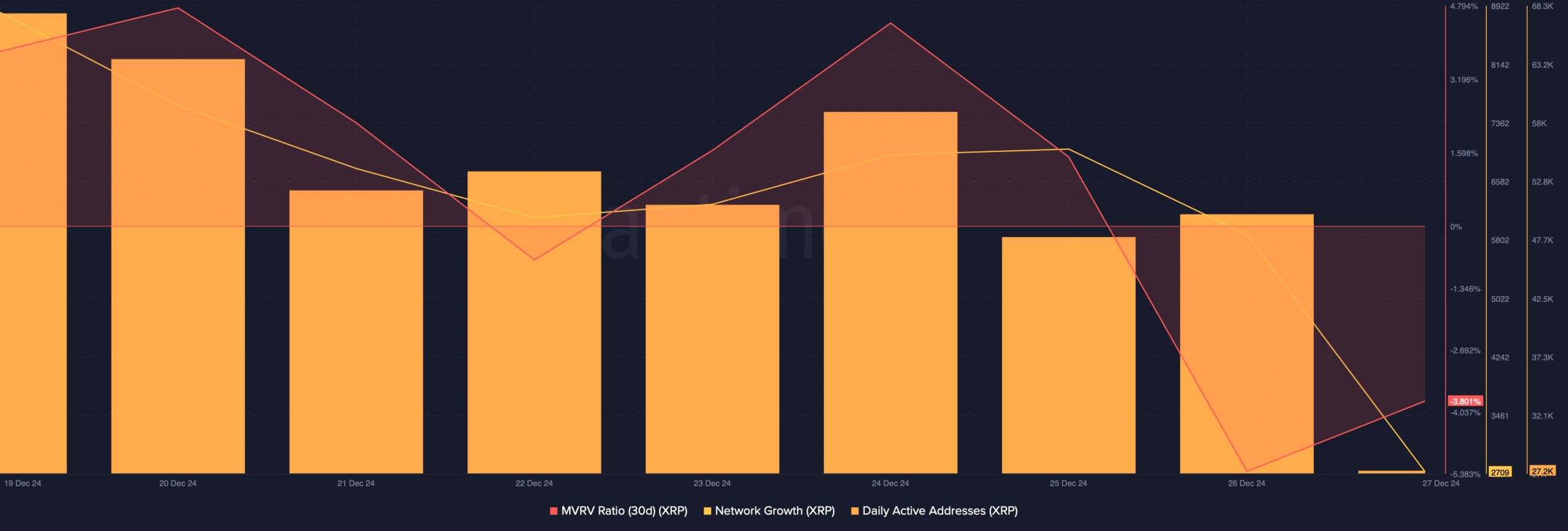 然而,并非所有指标都对XRP币有利。例如,XRP币的每日活跃地址数量上周有所下降,表明网络活动减少。XRP币网络增长的下降也进一步证明了这一点。