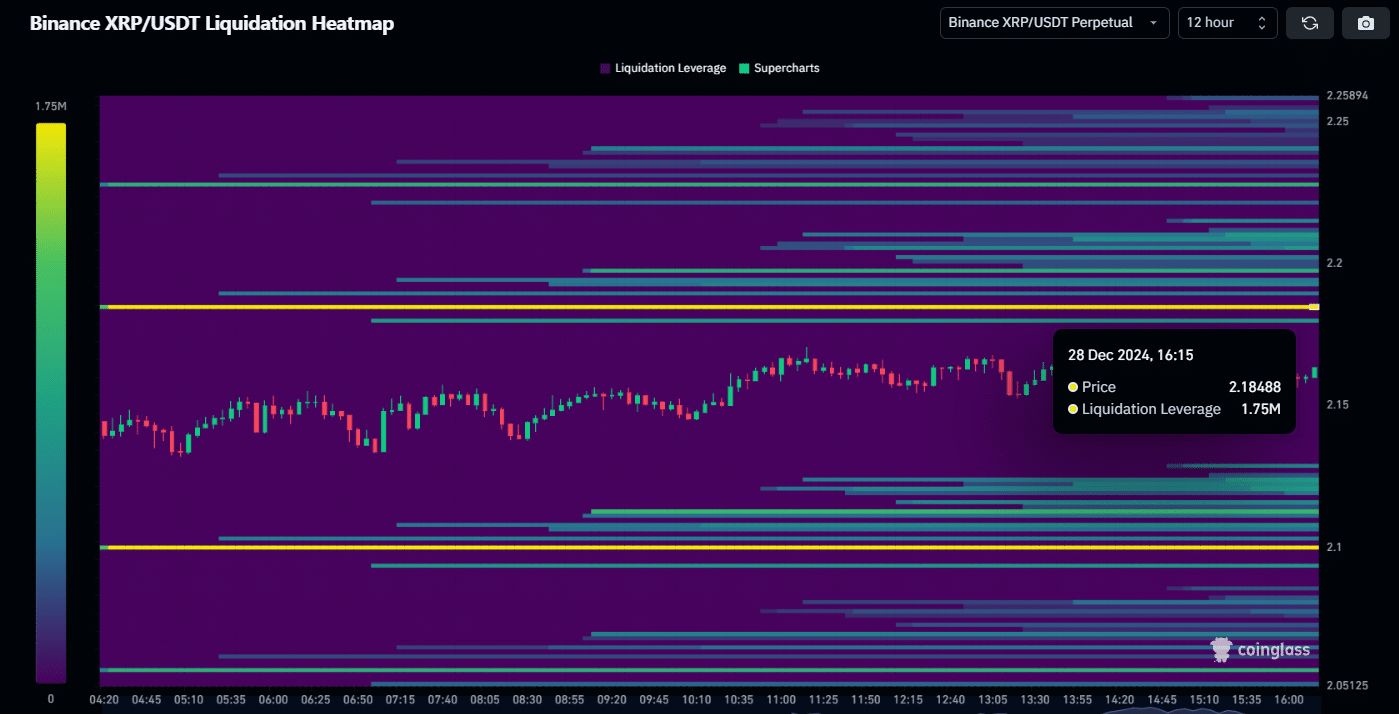 放大12小时图表,我们可以看到强劲的流动性位于2.18美元,其中175万个杠杆头寸似乎在发挥作用。如果XRP币能够保持这一水平,它可能会引发反弹,为空头轧平创造完美风暴。