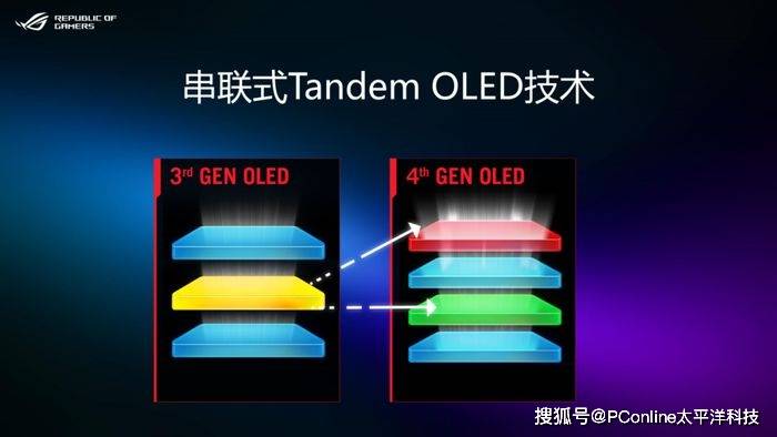 ROG超杀27 Pro二代电竞显示器采用了串联式Tandem OLED技术,将发光层从三层拆分为四层,将黄色层拆分为两个独立的红色层和绿色层从亮度、色彩与OLED寿命,全方位得到了大幅提升。