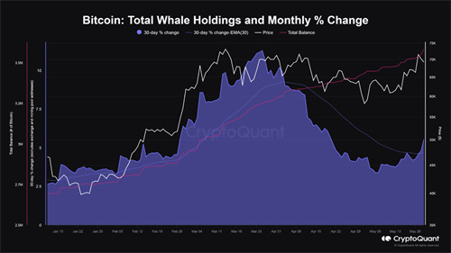 一位匿名分析师在CryptoQuant Quicktake的一篇文章中指出,比特币鲸鱼们表现出了越来越强的购买欲望,重新活跃在市场上。关键指标是鲸鱼总持有量和追踪30天余额百分比变化的移动平均值。