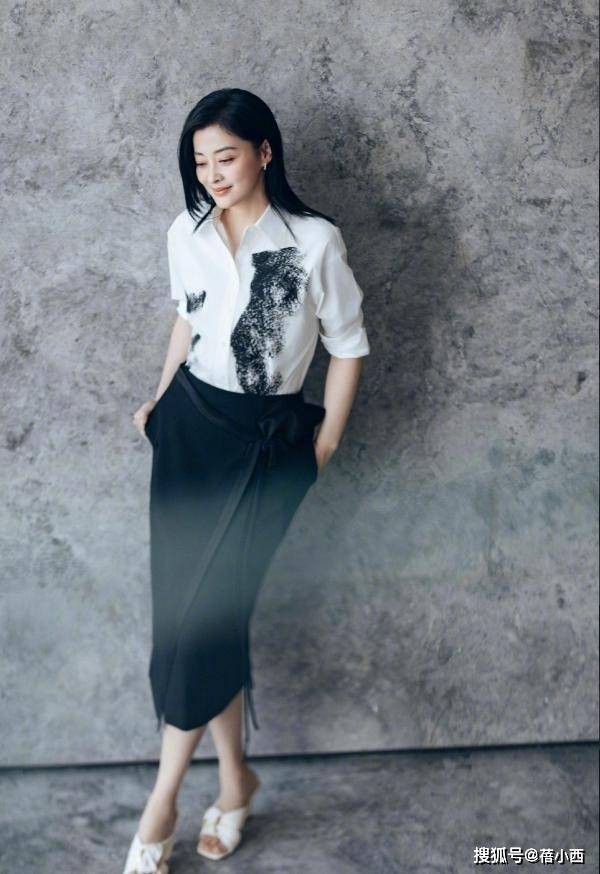 和衬衫搭的黑色半身裙也很显气质,哑光的垂坠面料不像亮面裙那样扎眼,腰侧打了个松散的结,刚好把腰线卡在最细的位置,半身裙的裙摆开叉到大腿中部,露出的腿部线条降低了沉闷感,更显腿细。