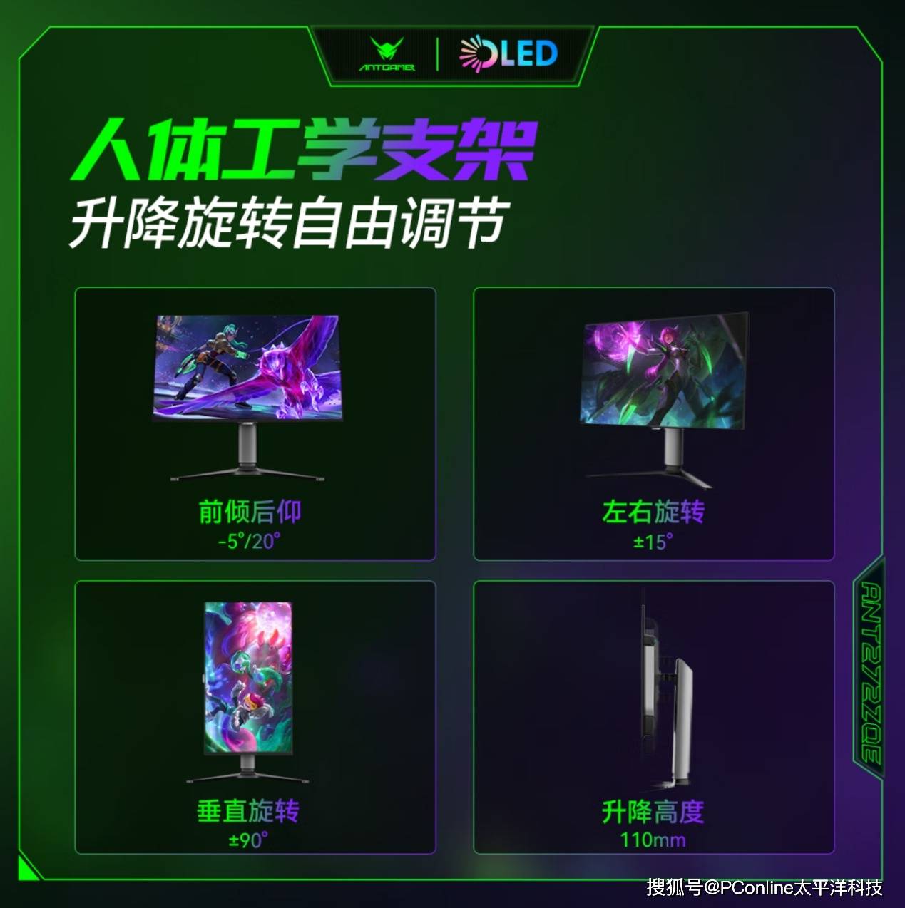 在外观设计上,OLED面板的结构优势使其背部更显轻薄 ,搭配四边无边框设计,带来了极强的视觉冲击力和沉浸感。值得称赞的是,它配备了功能全面的人体工学支架,支持-5°至20°的前后俯仰、-20°至20°的水平旋转、-90°至90°的垂直旋转以及高达110mm的上下升降,让每一位玩家都能找到最舒适的观看角度,告别颈椎疲劳。