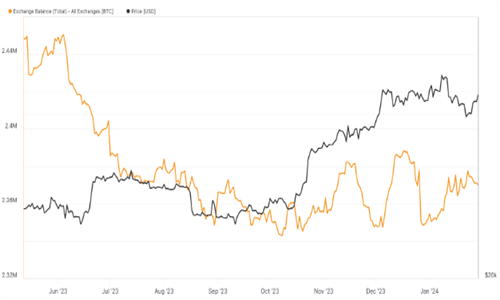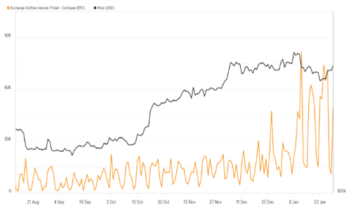 与此同时,ETF的流量数据对比特币多头来说也是利好消息。之前,Grayscale Bitcoin Trust (GBTC)每天向Coinbase发送约7亿美元的BTC,而最近的每日流出量已降至不到2亿美元。在比特币方面,1月25日有24000枚BTC流出,而到了1月29日,流出量仅为6000多枚BTC。
