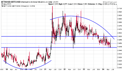 与此同时,分析师Tuur Demeester认为以太坊市场的狂热尚未显现。他在5月25日的帖子中分享了一张图表,指出ETH/BTC对需要在突破0.06水平后才能转为看涨。这就像是在说,我们还需要再加把劲!