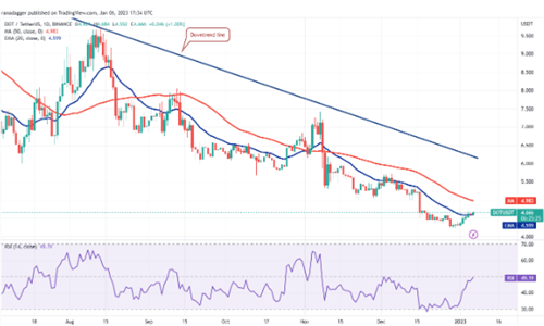 如果价格能够突破$4.68,DOT/USDT货币对可能会尝试反弹至50日均线($4.98)。这个价位可能会再次成为阻力位,但如果多头能够突破,价格可能会进一步上涨至下降趋势线。