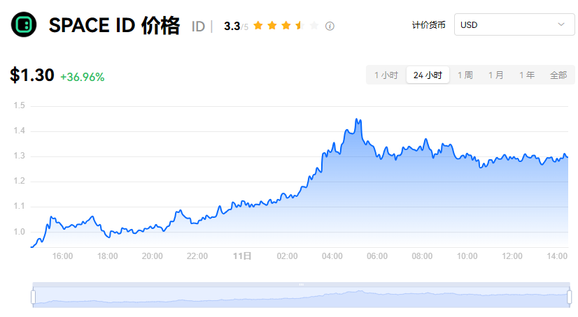 24 小时最低/最高价24 小时最低$0.93最新价格 $1.3024 小时最高$1.48热度排行24市值排行102市值$5.59亿添加自选人数 (百分比)1.02%历史最高价$1.14+14.44%(+$0.17)2024年3月11日(今日)历史最低价$0.17+687.34%(+$1.14)2023年8月18日(7 月前)首次发行时间2023/03/22首次发行价$0.00流通总量4.31亿 ID流通市值$5.59亿
